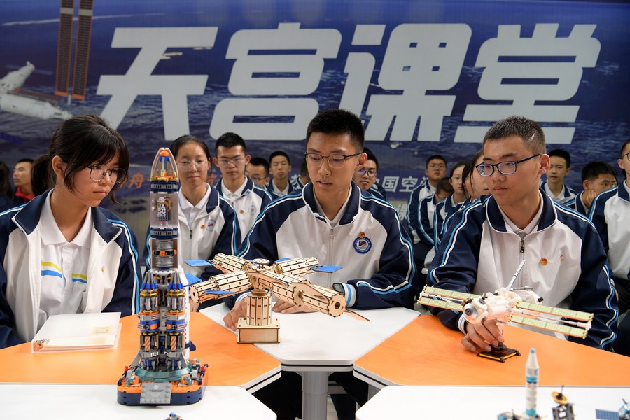 Students attend the fourth live class of the "Tiangong Class" series at Beihang University in Beijing, capital of China, Sept. 21, 2023. (Xinhua/Ju Huanzong)