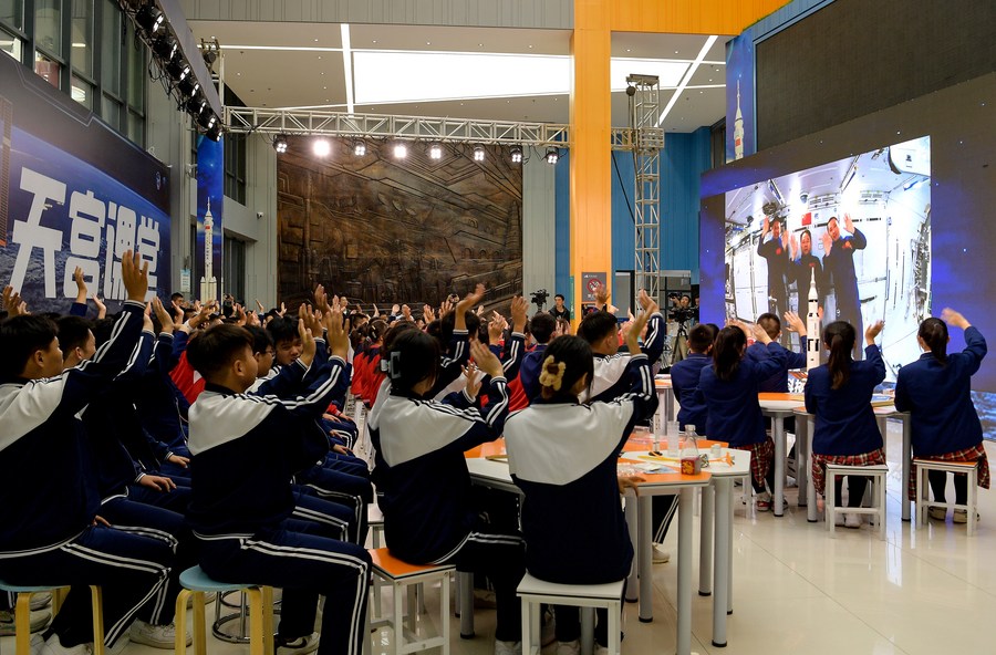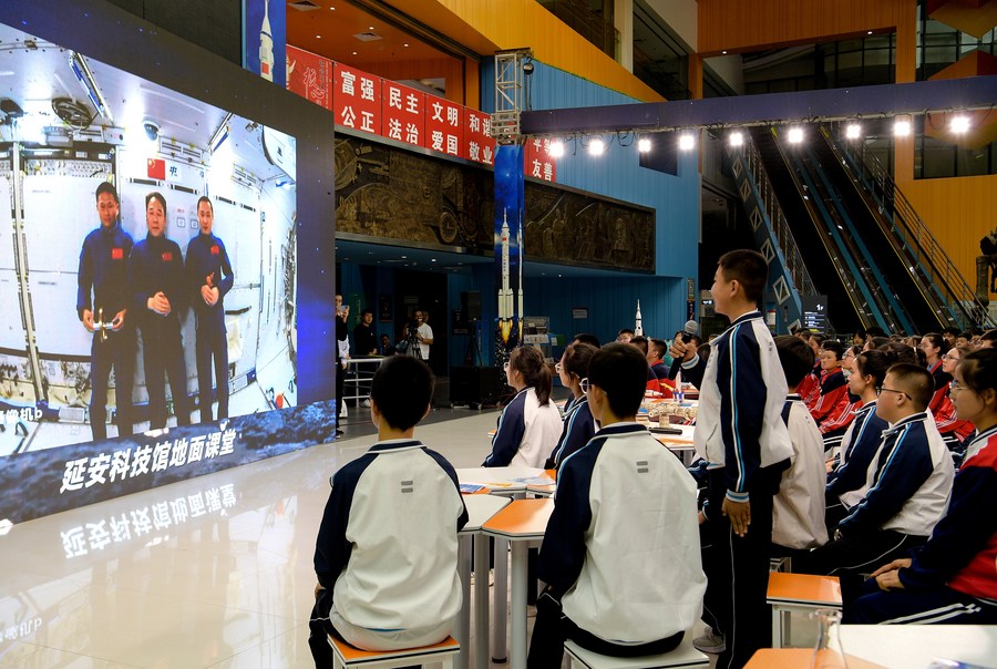 Students attend the fourth live class of the "Tiangong Class" series in Yan'an Science and Technology Museum in Yan'an, northwest China's Shaanxi Province, Sept. 21, 2023. (Photo by Deng Zhihong/Xinhua)