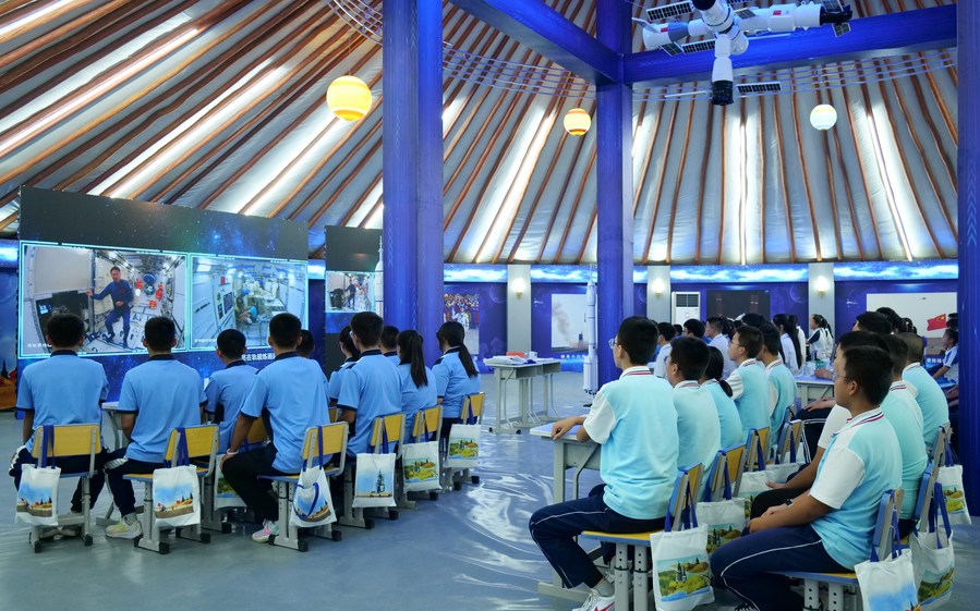 Students attend the fourth live class of the "Tiangong Class" series in Ejin Banner of Alxa League, north China's Inner Mongolia Autonomous Region, Sept. 21, 2023. (Photo by Ao Qi/Xinhua)