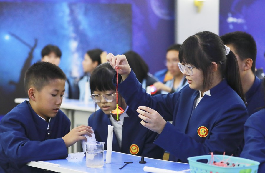 Students conduct experiments in Ejin Banner of Alxa League, north China's Inner Mongolia Autonomous Region, Sept. 21, 2023. (Photo by Ao Qi/Xinhua)