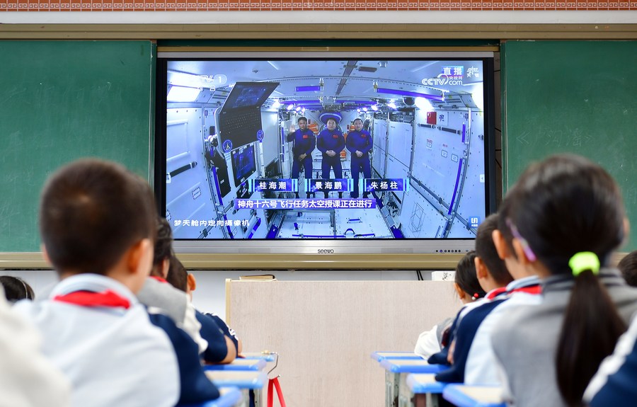 Students attend the fourth live class of the "Tiangong Class" series at a primary school in Qinhuangdao, north China's Hebei Province, Sept. 21, 2023. (Photo by Cao Jianxiong/Xinhua)