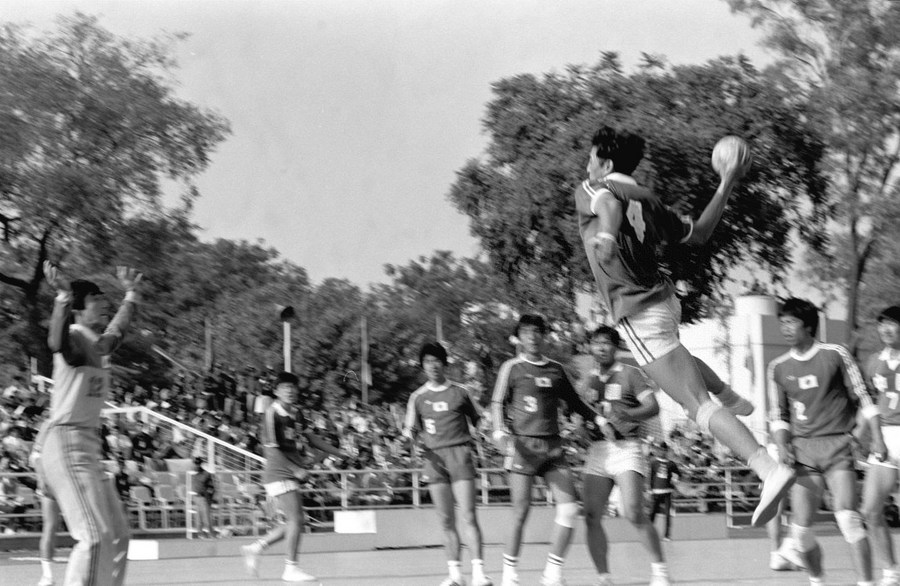 China's Wu Mingqun (No. 4) in action during the men's handball final against Japan at the Asian Games in New Delhi, India, Nov. 30, 1982. (Xinhua/Liu Xinning)