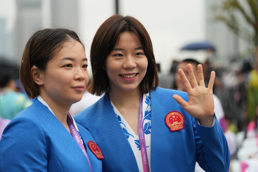 Women's doubles badminton world champions Chen Qingchen (L) and Jia Yifan of China pose after the opening ceremony for the Hangzhou Asian Games Village on Sept. 16, 2023. (Xinhua/Xue Yuge)