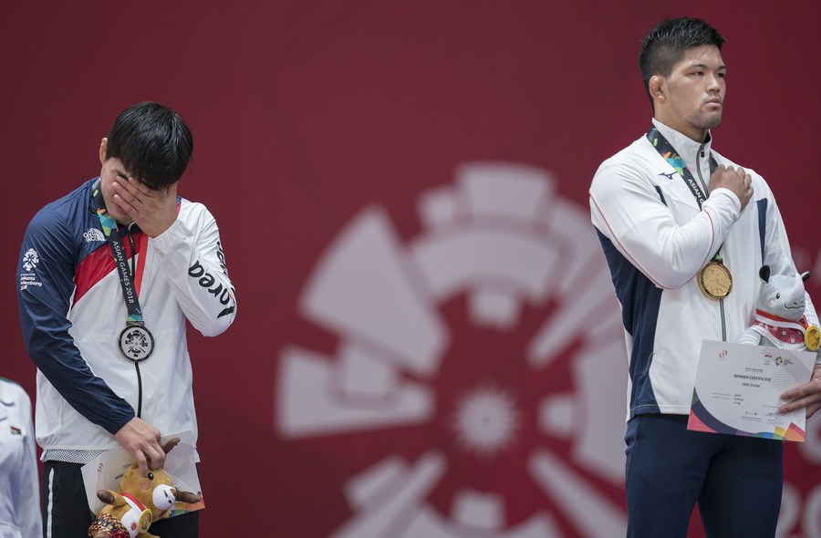 Gold medalist Ono Shohei (R) of Japan and silver medalist An Chang-rim of South Korea stand on the podium for the men's 73kg judo at the 18th Asian Games in Jakarta, Indonesia on Aug. 30, 2018. (Xinhua/Fei Maohua)