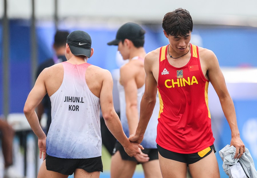 Chen Yan (R) of China and Lee Ji-hun of South Korea greet each other after the men's individual modern pentathlon laser-run at the Hangzhou Asian Games on Sept. 22, 2023. (Xinhua/Shan Yuqi)