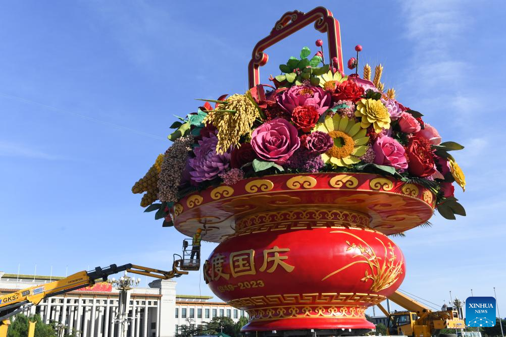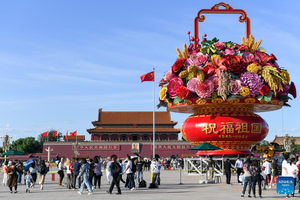 This photo taken on Sept. 22, 2023 shows a "flower basket" at Tian'anmen Square in Beijing, capital of China. The 18-meter-tall display in the shape of a flower basket is placed at Tian'anmen Square as a decoration for the upcoming National Day holiday. (Xinhua/Ju Huanzong)