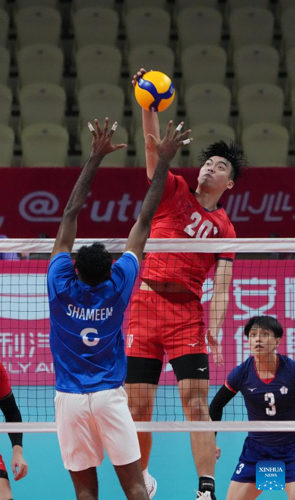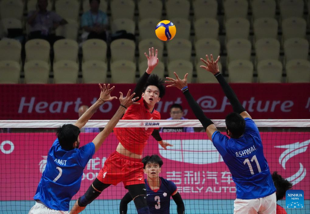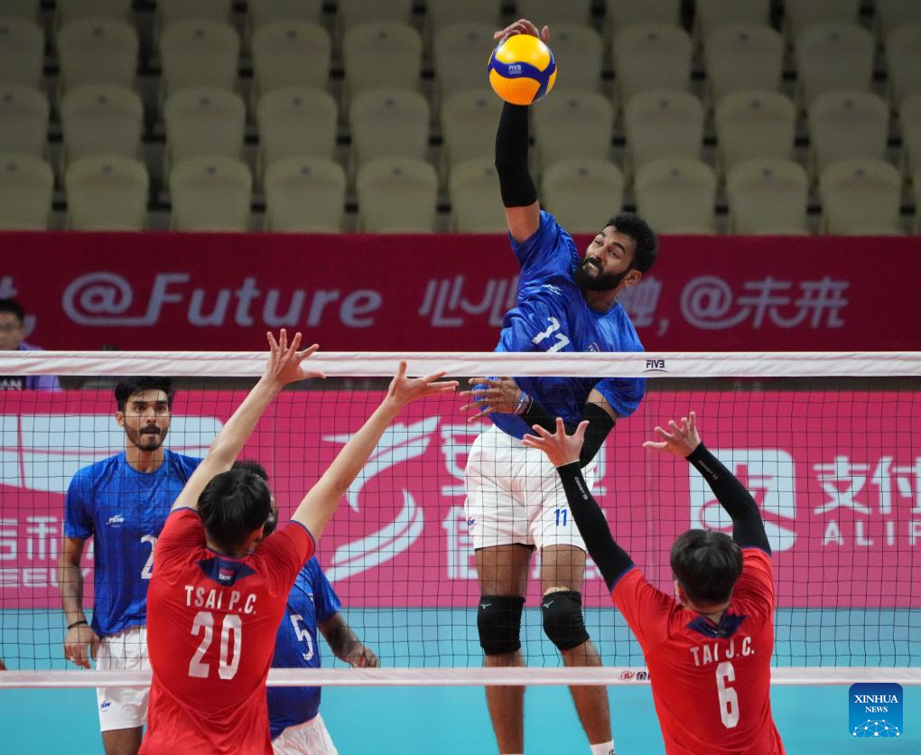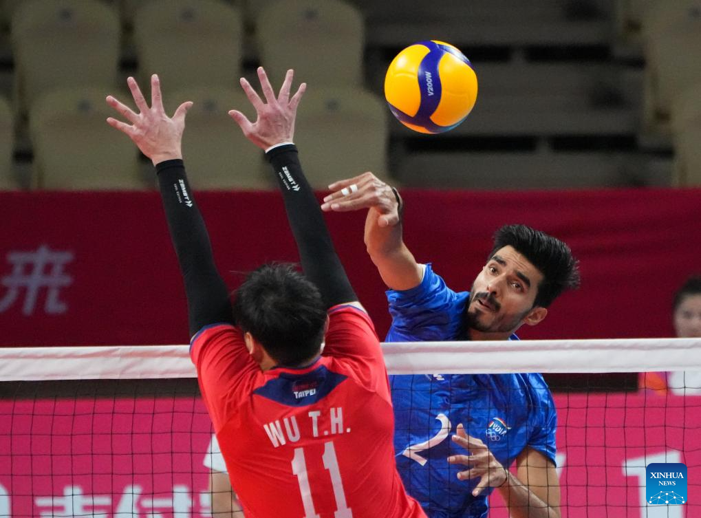 Tseng Hsiang-Ming (top C) of Chinese Taipei spikes the ball during the Volleyball Men's Cross Match between India and Chinese Taipei at the 19th Asian Games in Shaoxing, east China's Zhejiang Province, Sept. 22, 2023. (Xinhua/Weng Xinyang)