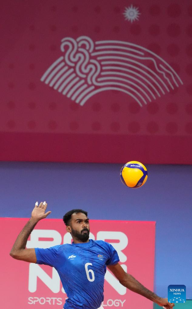 Shameemudheen Ammarambath of India spikes the ball during the Volleyball Men's Cross Match between India and Chinese Taipei at the 19th Asian Games in Shaoxing, east China's Zhejiang Province, Sept. 22, 2023. (Xinhua/Weng Xinyang)