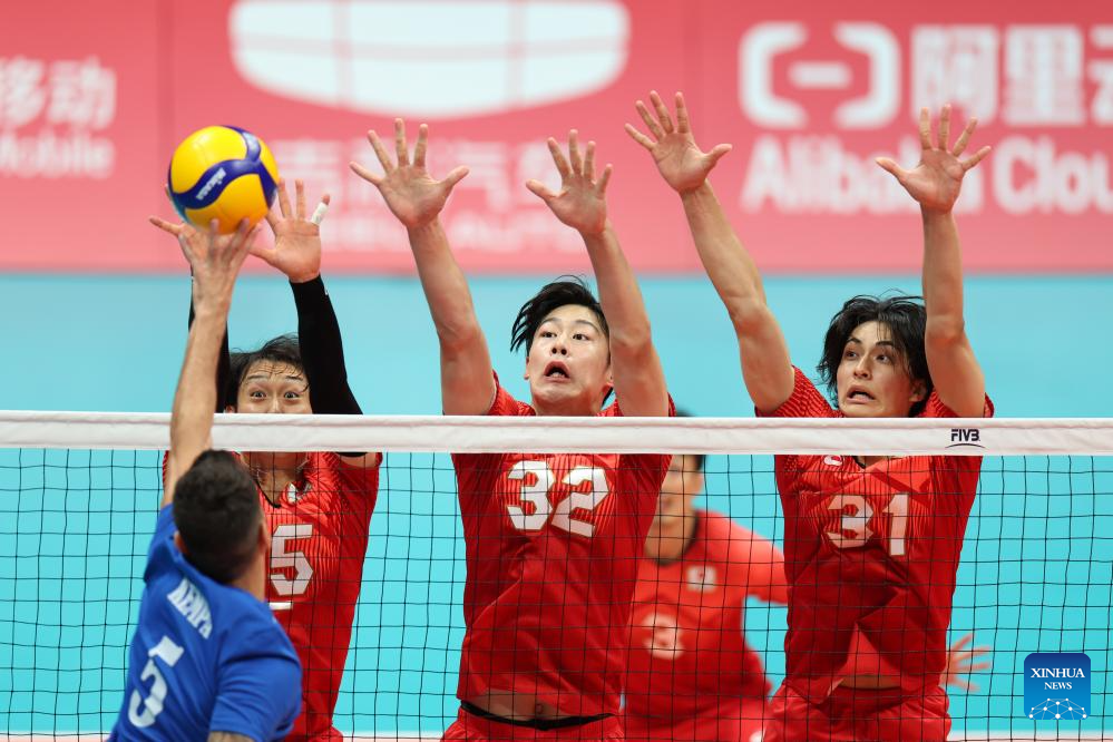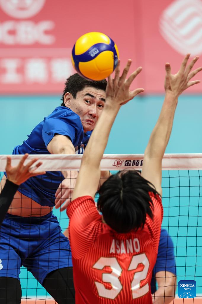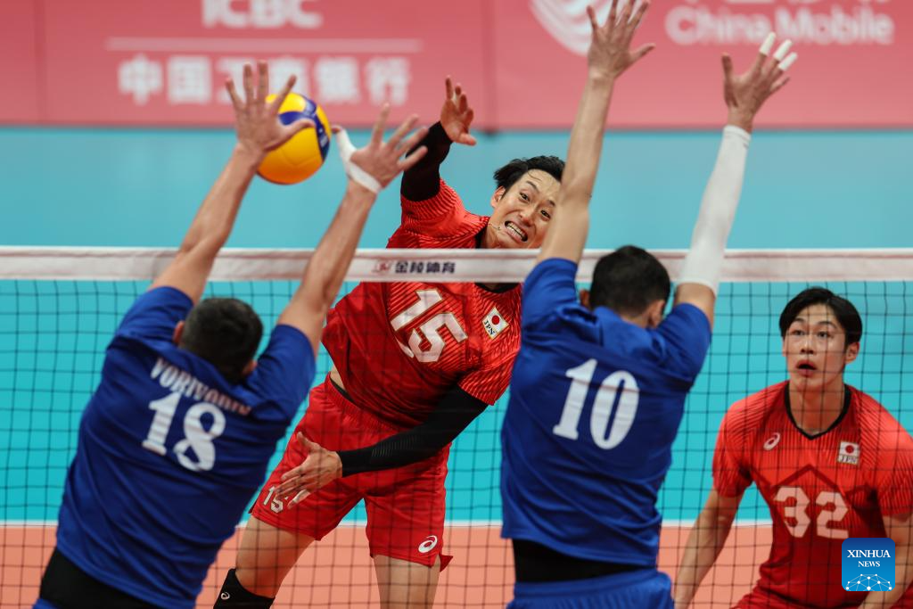 Yanagida Masahiro (2nd L) of Japan spikes the ball during the Volleyball Men's Cross Match between Kazakhstan and Japan at the 19th Asian Games in Hangzhou, east China's Zhejiang Province, Sept. 22, 2023. (Xinhua/Zhu Zheng)