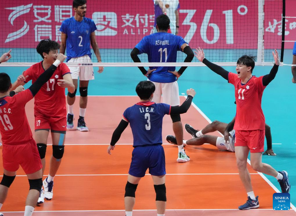 Players of Chinese Taipei celebrate scoring during the Volleyball Men's Cross Match between India and Chinese Taipei at the 19th Asian Games in Shaoxing, east China's Zhejiang Province, Sept. 22, 2023. (Xinhua/Weng Xinyang)