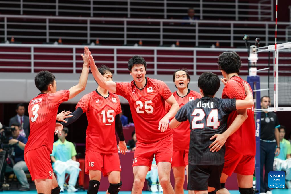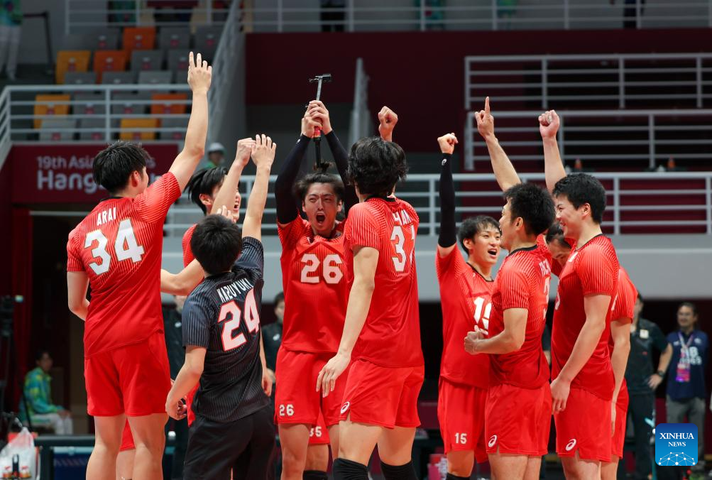 Team Japan celebrate after winning the Volleyball Men's Cross Match between Kazakhstan and Japan at the 19th Asian Games in Hangzhou, east China's Zhejiang Province, Sept. 22, 2023. (Xinhua/Zhu Zheng)