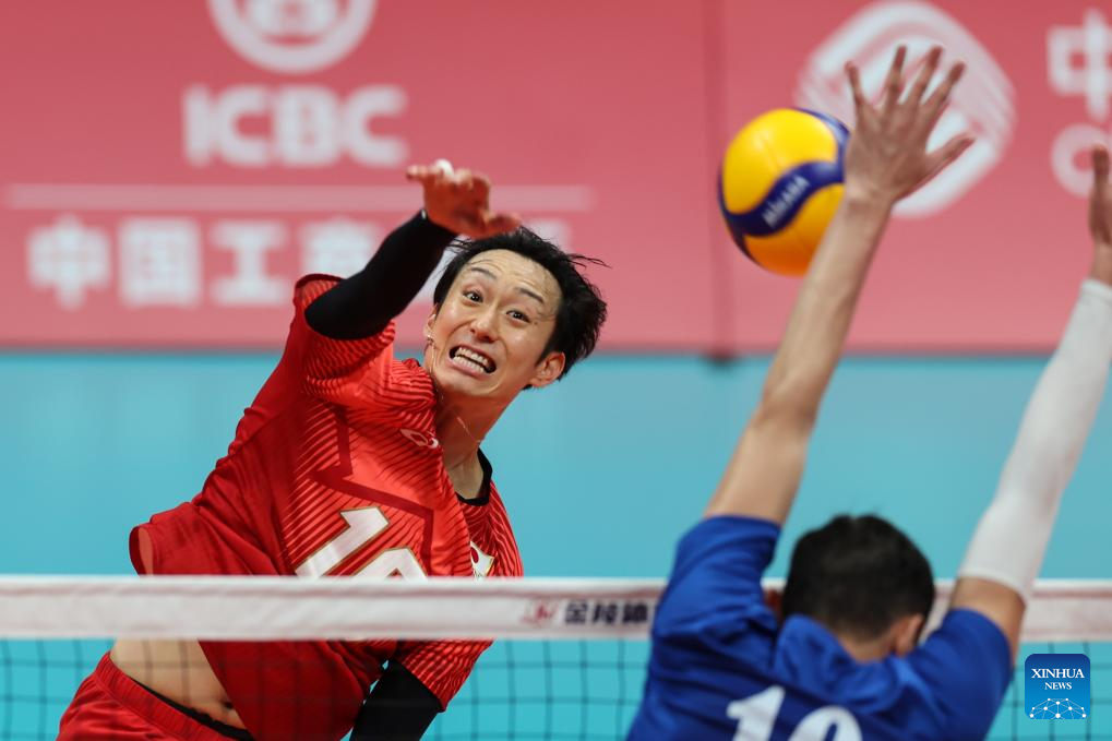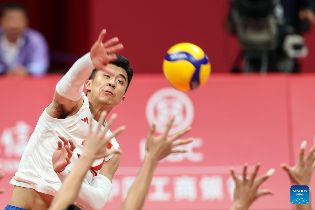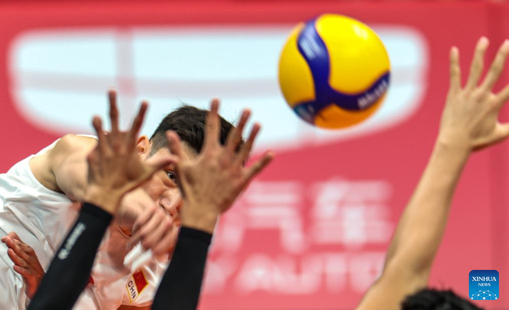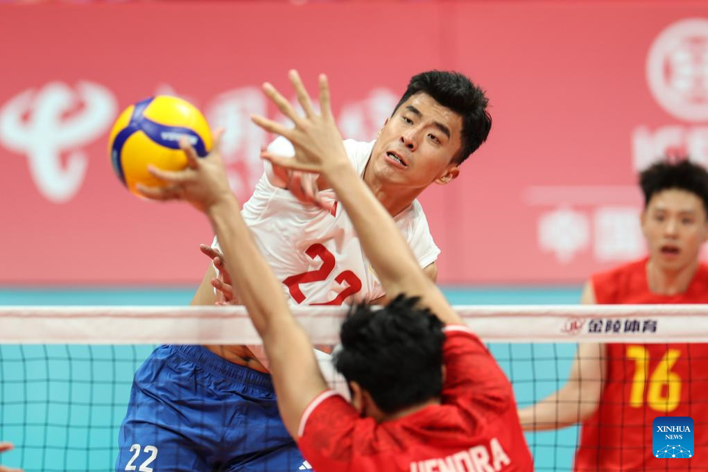 Zhang Jingyin of China spikes the ball during the Volleyball Men's Cross Match between China and Indonesia at the 19th Asian Games in Hangzhou, east China's Zhejiang Province, Sept. 22, 2023. (Xinhua/Zhu Zheng)