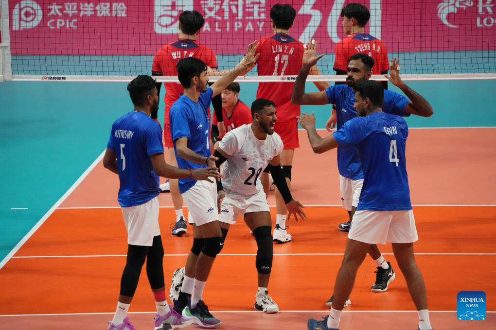 Players of India celebrate scoring during the Volleyball Men's Cross Match between India and Chinese Taipei at the 19th Asian Games in Shaoxing, east China's Zhejiang Province, Sept. 22, 2023. (Xinhua/Weng Xinyang)