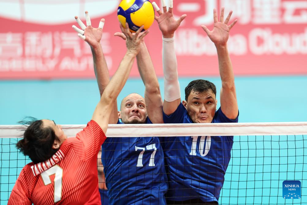 Maxim Michshenko (2nd R) and Zhaxylyk Tleulin (R) of Kazakhstan block the ball during the Volleyball Men's Cross Match between Kazakhstan and Japan at the 19th Asian Games in Hangzhou, east China's Zhejiang Province, Sept. 22, 2023. (Xinhua/Zhu Zheng)