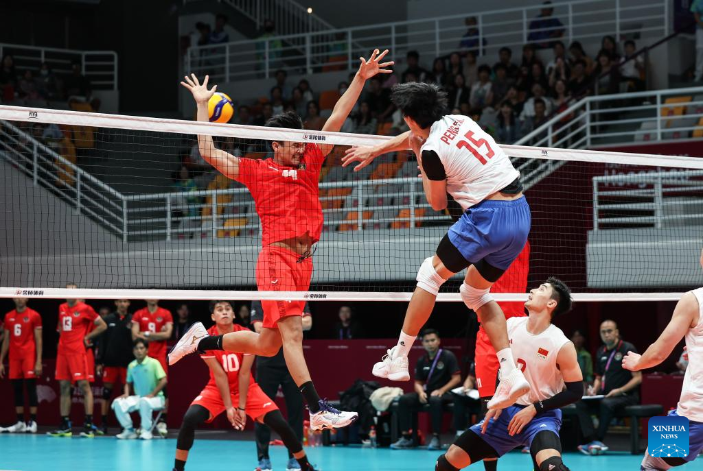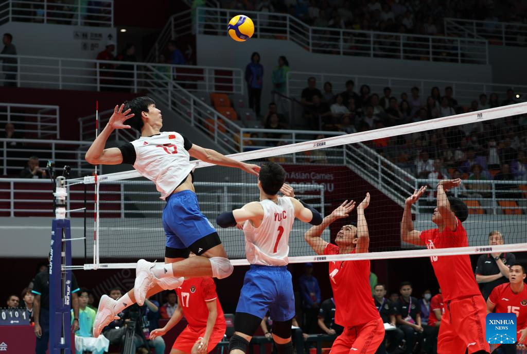 Peng Shikun (top R) of China spikes the ball during the Volleyball Men's Cross Match between China and Indonesia at the 19th Asian Games in Hangzhou, east China's Zhejiang Province, Sept. 22, 2023. (Xinhua/Zhu Zheng)