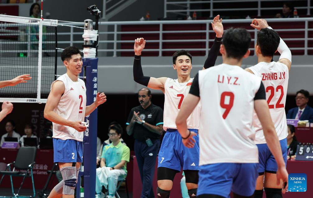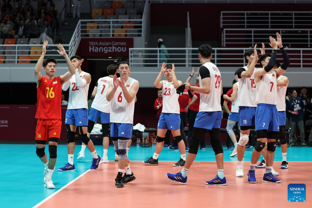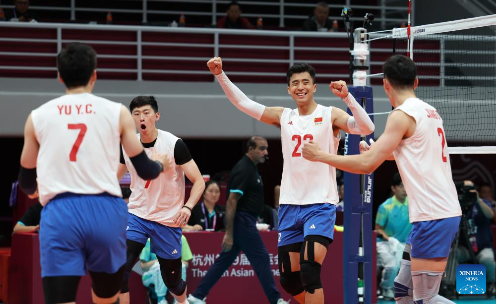 Players of China celebrate winning the Volleyball Men's Cross Match between China and Indonesia at the 19th Asian Games in Hangzhou, east China's Zhejiang Province, Sept. 22, 2023. (Xinhua/Zhu Zheng)