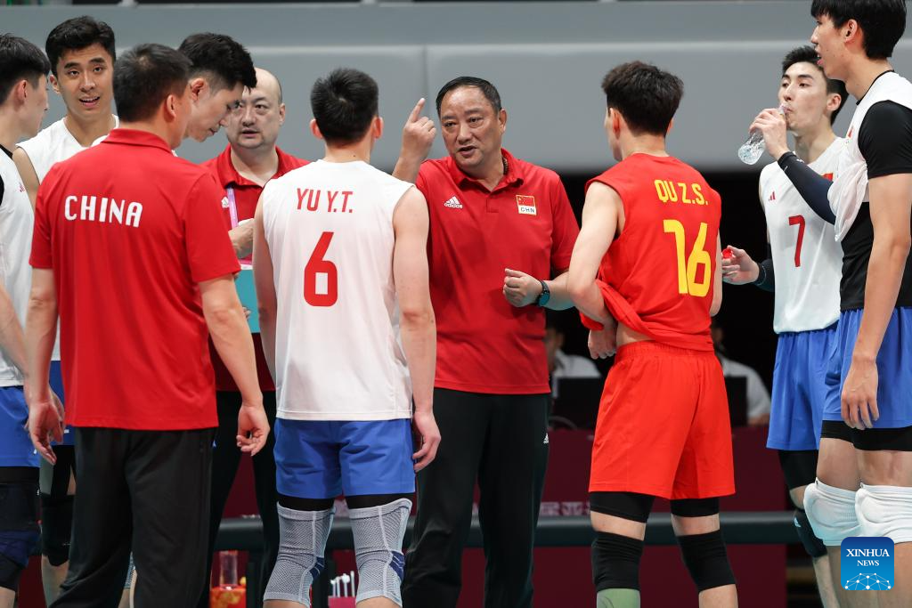 China's Head Coach Wu Sheng (C) instructs players during the Volleyball Men's Cross Match between China and Indonesia at the 19th Asian Games in Hangzhou, east China's Zhejiang Province, Sept. 22, 2023. (Xinhua/Zhu Zheng)