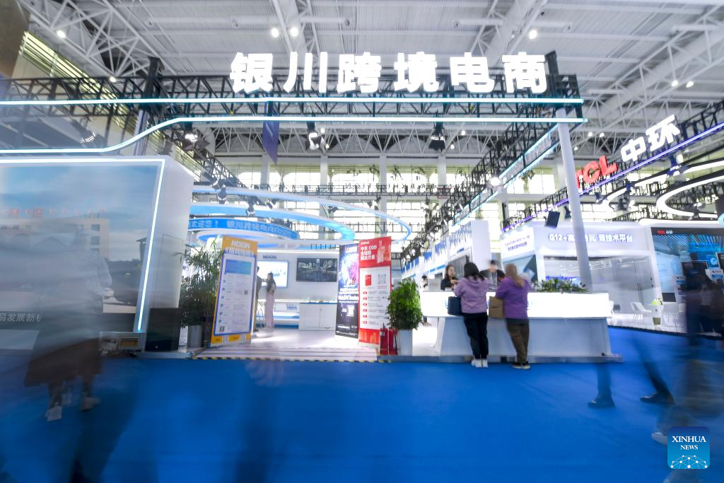 Visitors learn about cross-border e-commerce at the digital economy exhibition area of the sixth China-Arab States Expo in Yinchuan, northwest China's Ningxia Hui Autonomous Region, Sept. 22, 2023. The sixth China-Arab States Expo opened Thursday in Yinchuan, capital of northwest China's Ningxia Hui Autonomous Region.