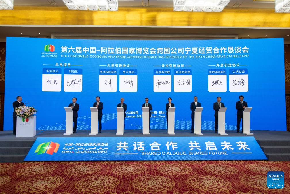 This photo taken on Sept. 21, 2023 shows the signing ceremony of the Multinationals' Economic and Trade Cooperation Meeting in Ningxia of the sixth China-Arab States Expo in Yinchuan, northwest China's Ningxia Hui Autonomous Region. The sixth China-Arab States Expo opened Thursday in Yinchuan, capital of northwest China's Ningxia Hui Autonomous Region.