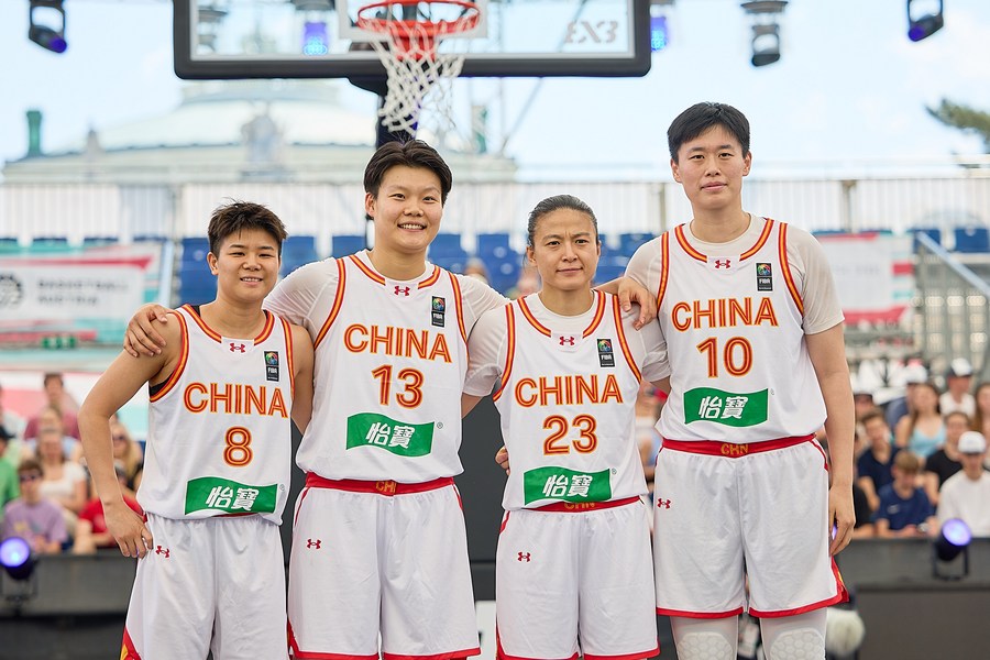 China's Zhang Yi, Wan Jiyuan, Wang Lili, Zhang Zhiting (L to R) pose for photos before the FIBA 3X3 World Cup women's pool D match against Romania in Vienna, Austria, June 2, 2023. (Photo by Georges Schneider/Xinhua)