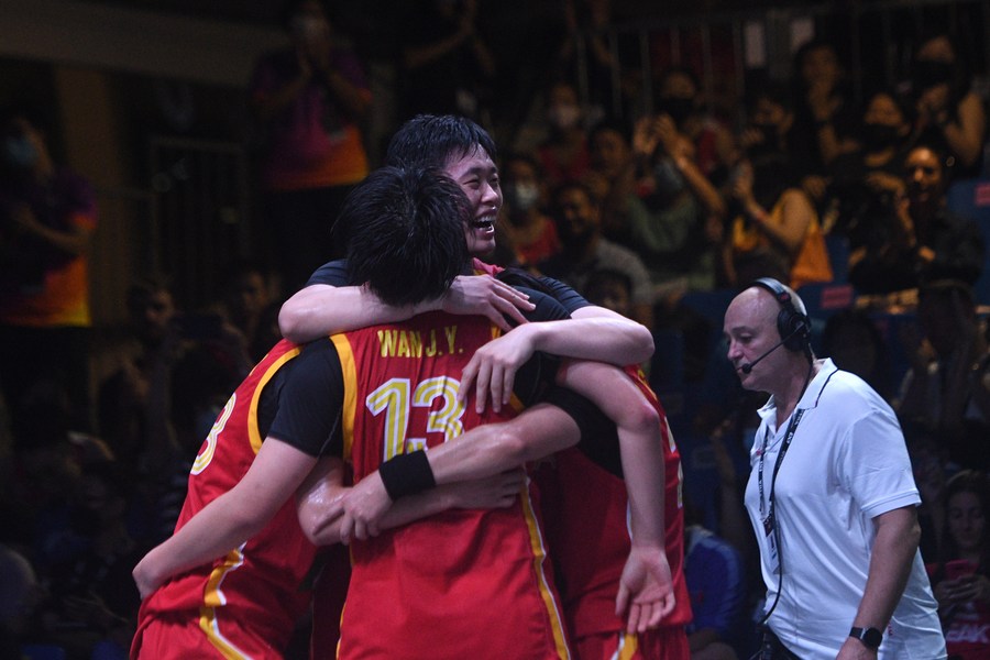 Players of China celebrate after winning the FIBA 3x3 Asia Cup women's final against Australia held in Singapore on July 10, 2022. (Photo by Then Chih Wey/Xinhua)