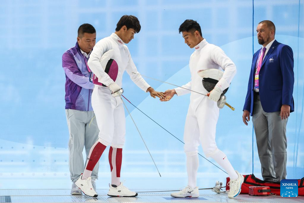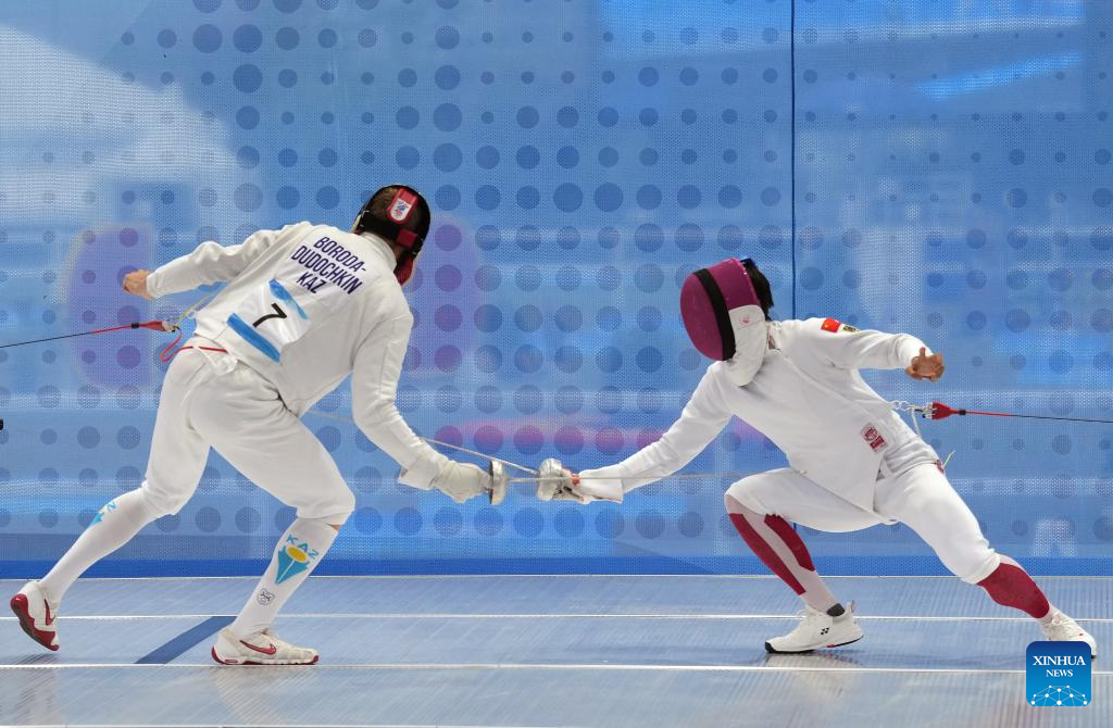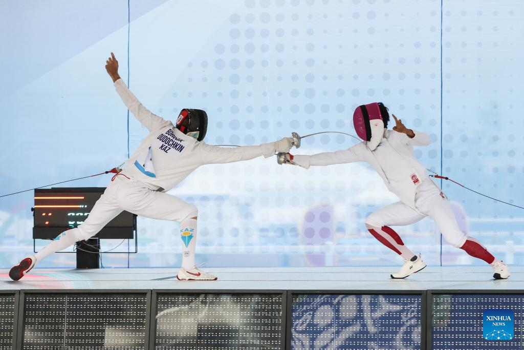 China's Chen Yan (R) competes against Kazakhstan's Georgiy Boroda-Dudochkin during the men's individual fencing bonus round of Modern Pentathlon at the 19th Asian Games in Hangzhou, east China's Zhejiang Province, Sept. 22, 2023. (Xinhua/Shan Yuqi)