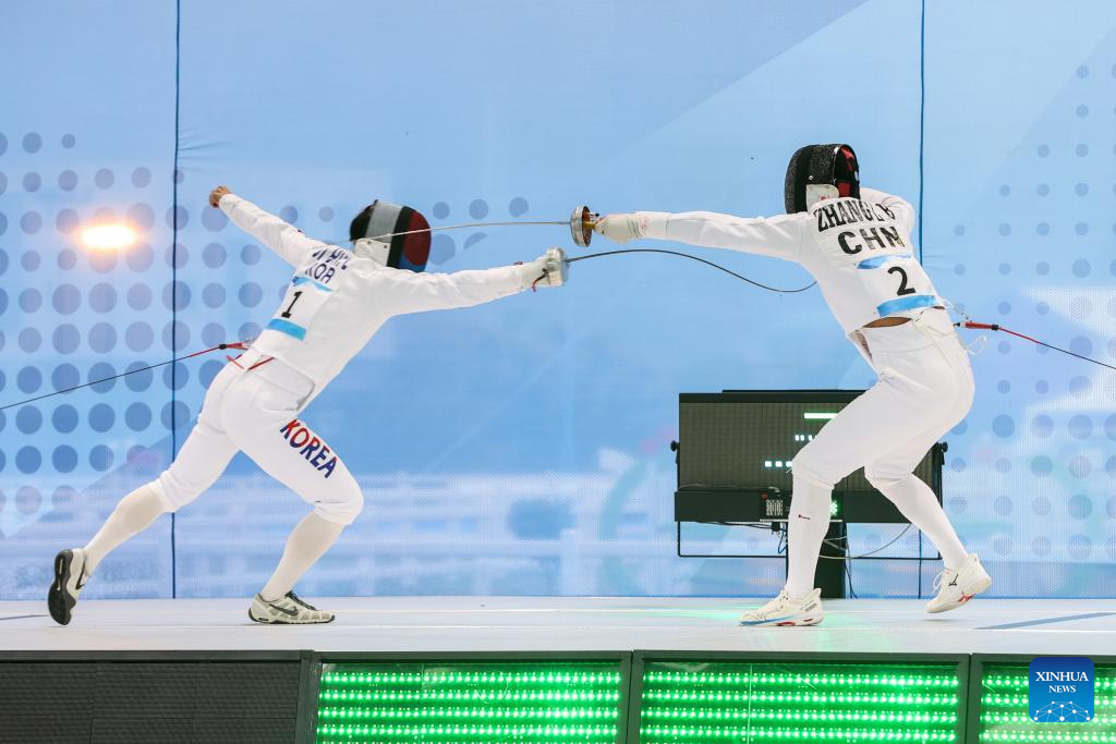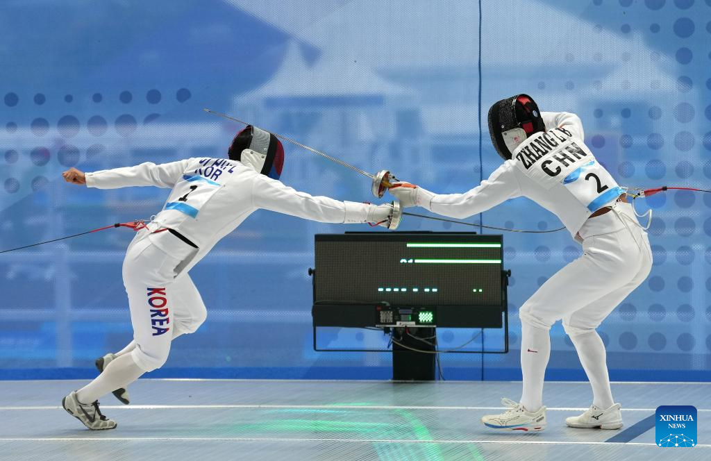 China's Zhang Linbin (R) competes against South Korea's Lee Jihun during the men's individual fencing bonus round of Modern Pentathlon at the 19th Asian Games in Hangzhou, east China's Zhejiang Province, Sept. 22, 2023. (Xinhua/Wan Xiang)