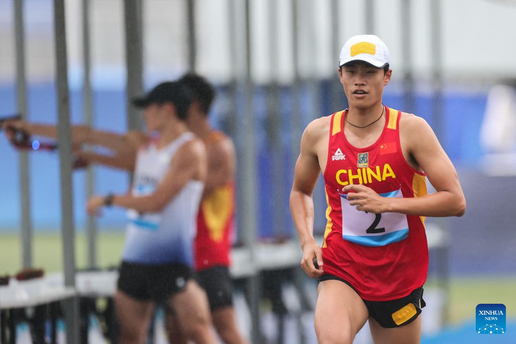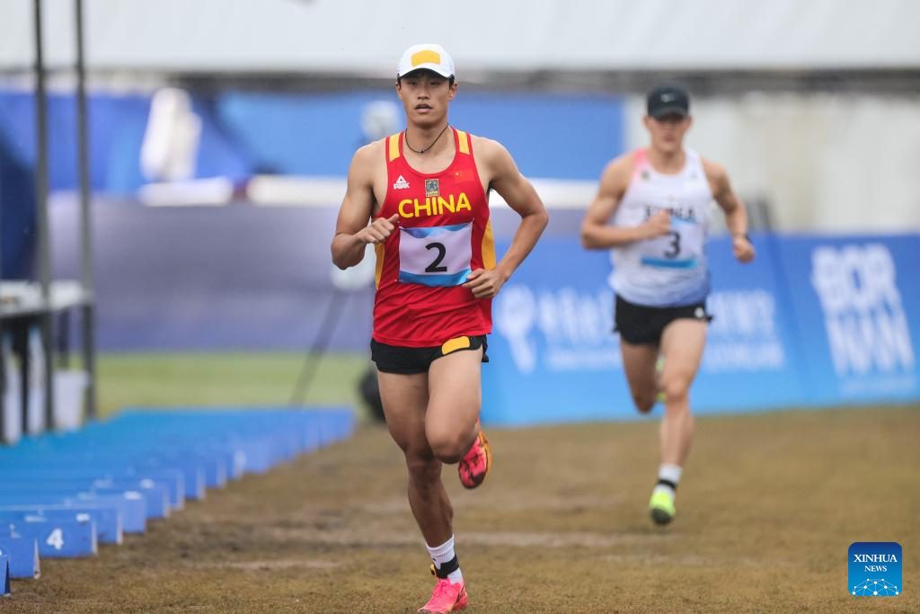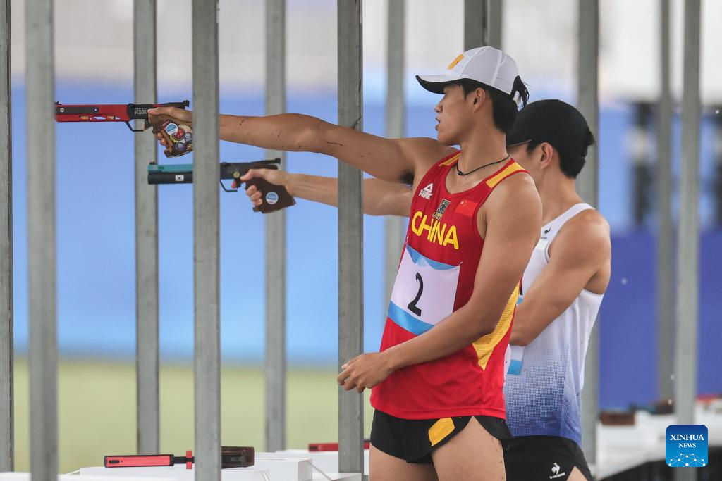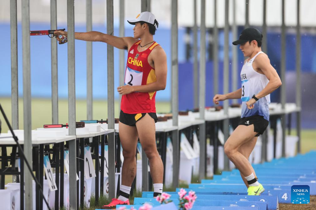Chen Yan (R) of China competes during the men's individual laser-run of Modern Pentathlon at the 19th Asian Games in Hangzhou, east China's Zhejiang Province, Sept. 22, 2023. (Xinhua/Shan Yuqi)