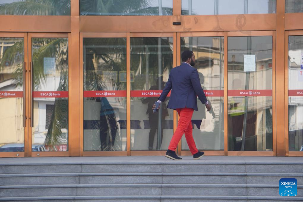 A client enters the headquarters of the Sino-Congolese Bank for Africa (BSCA) in Brazzaville, capital of the Republic of the Congo, Sept. 21, 2023. (Xinhua/Shi Yu)