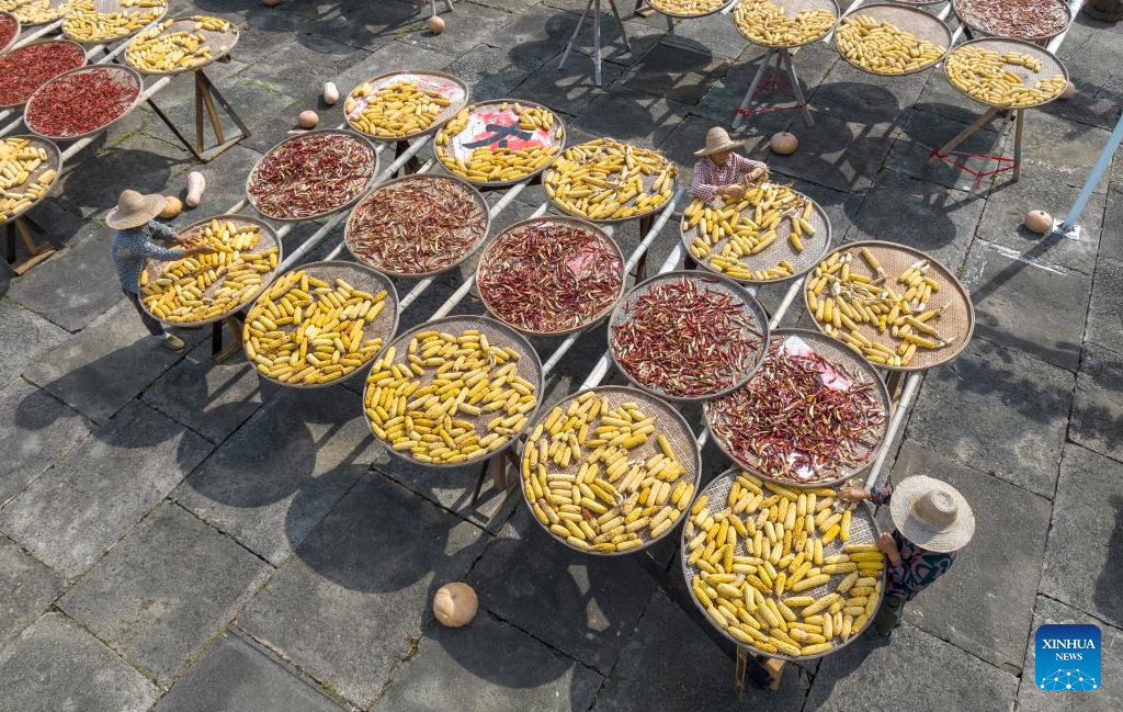 A villager dries corns on a drying yard at Chengkan Village in Huangshan City, east China's Anhui Province, Sept. 19, 2023. "Shaiqiu," or drying crops in autumn, is a rural tradition in China. Crops of different colors are placed to form various patterns which become attractions for tourists. (Photo by Fan Chengzhu/Xinhua)