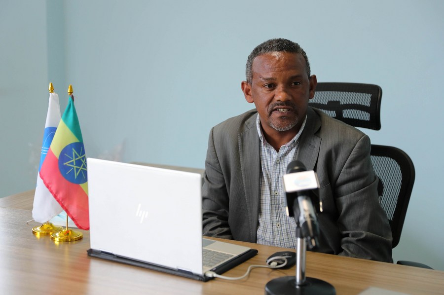 Abdissa Yilma, director general of the Ethiopian Space Science and Technology Institute, speaks during an interview with Xinhua in Addis Ababa, Ethiopia, April 29, 2021. (Xinhua/Wang Ping)