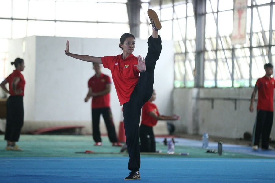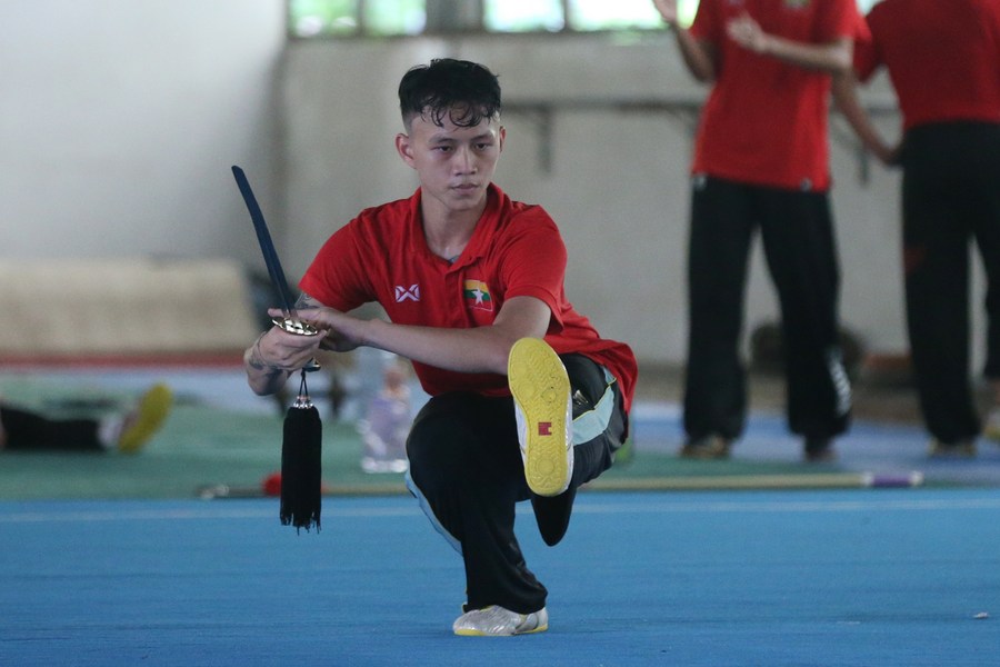 An athlete of Myanmar's Wushu team attends a training session for the upcoming Hangzhou Asian Games, in Yangon, Myanmar, Sept. 18, 2023. (Xinhua/Myo Kyaw Soe)