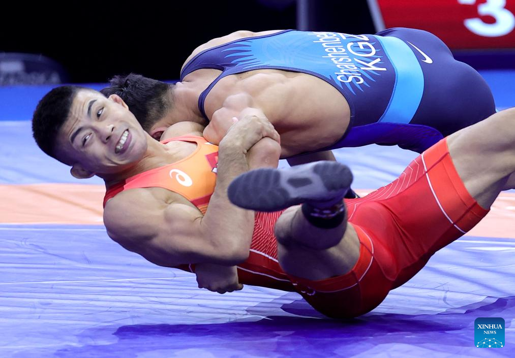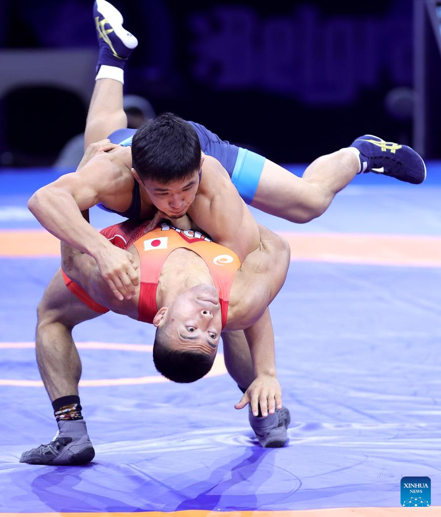 Japan's Fumita Kenichiro (down) and Kyrgyzstan's Zholaman Sharshenbekov compete during their match for gold medal of the men's 60kg Greco-Roman category at the Wrestling World Championships in Belgrade, Serbia, Sept. 23, 2023. (Photo by Predrag Milosavljevic/Xinhua)
