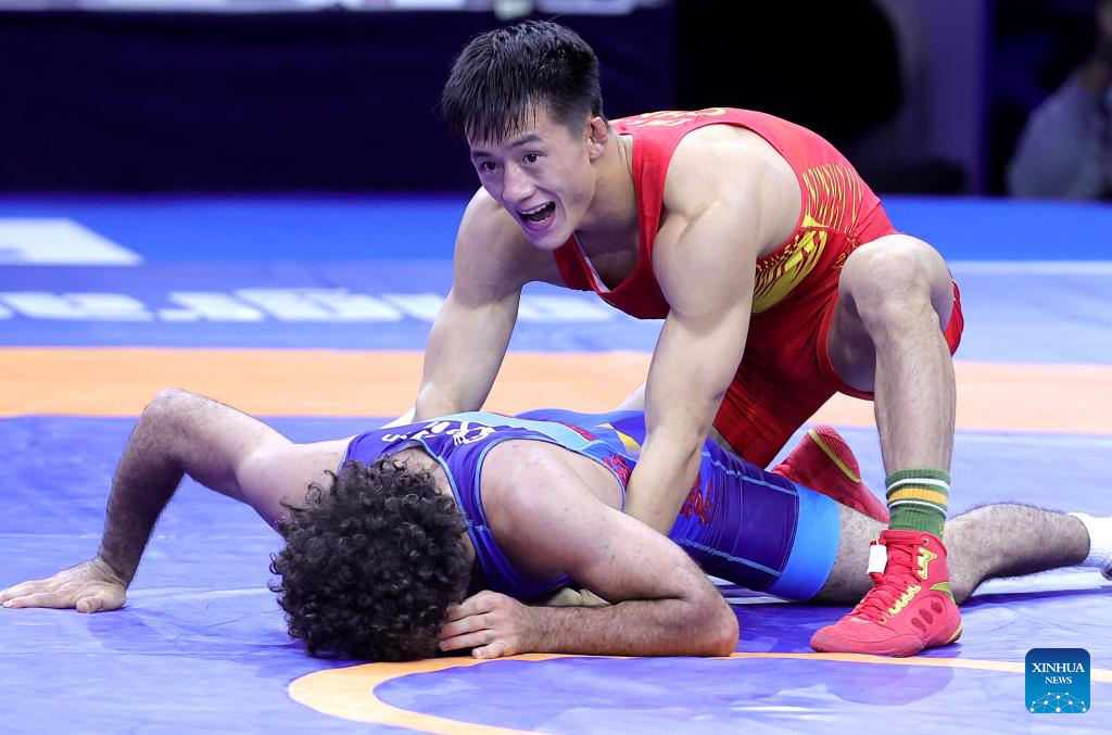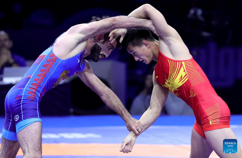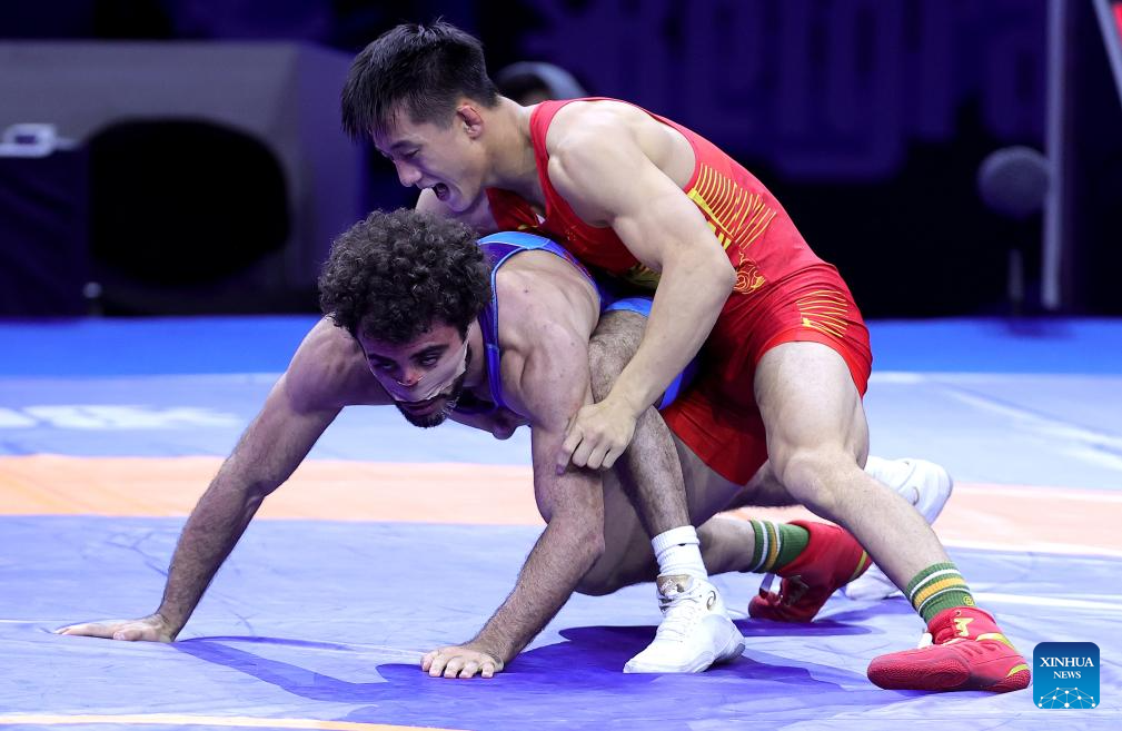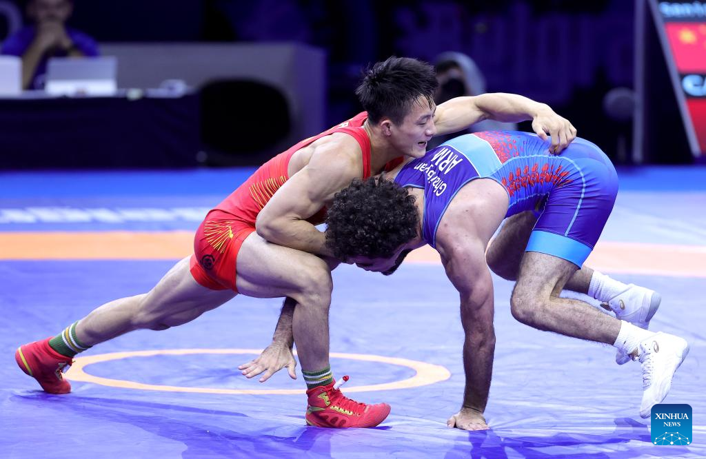 China's Cao Liguo (top) and Armenia's Gevorg Gharibyan compete during their men's 60kg Greco-Roman category bronze medal final at the Wrestling World Championships in Belgrade, Serbia, Sept. 23, 2023. (Photo by Predrag Milosavljevic/Xinhua)