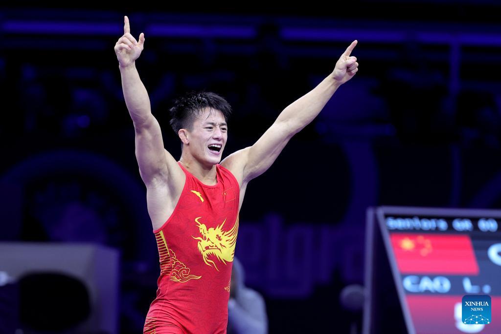 China's Cao Liguo celebrates victory against Armenia's Gevorg Gharibyan after the men's 60kg Greco-Roman category bronze medal final at the Wrestling World Championships in Belgrade, Serbia, Sept. 23, 2023. (Photo by Predrag Milosavljevic/Xinhua)