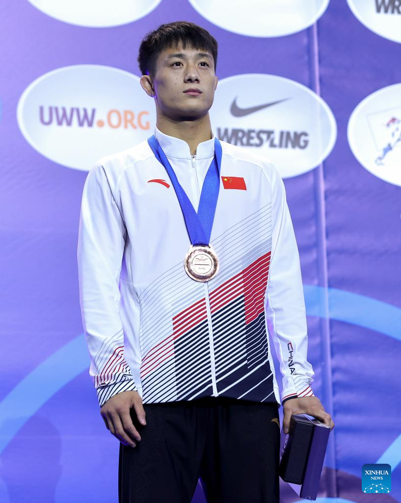 Bronze medalist China's Cao Liguo poses for photos during the awarding ceremony for the men's 60kg Greco-Roman category at the Wrestling World Championships in Belgrade, Serbia, Sept. 23, 2023. (Photo by Predrag Milosavljevic/Xinhua)