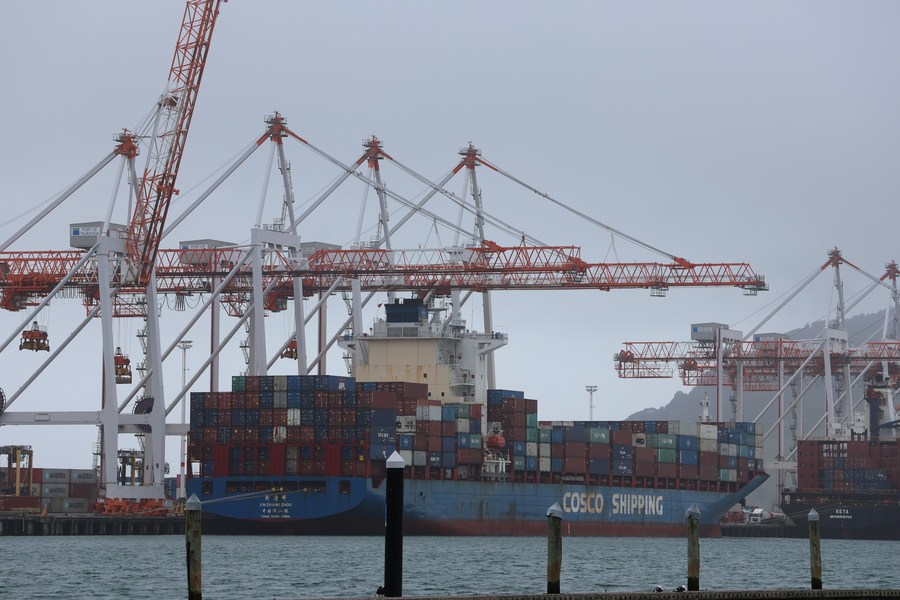 Photo taken on Sept. 23, 2023 shows exhibition goods from New Zealand, Vanuatu and Niue being shipped to China for the China International Import Expo (CIIE) 2023 at Tauranga Harbour, New Zealand. (Xinhua)