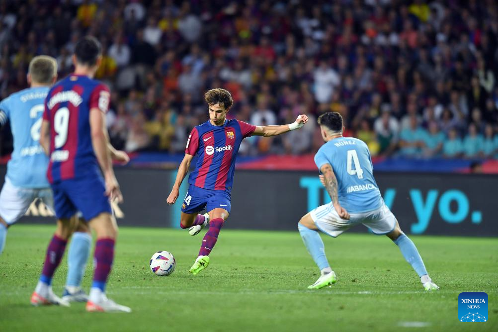 Joao Felix (2nd R) of Barcelona gets a chance to score during a La Liga football match between Barcelona and Celta Vigo in Barcelona, Spain, Sept. 23, 2023. (Photo by Joan Gosa/Xinhua)