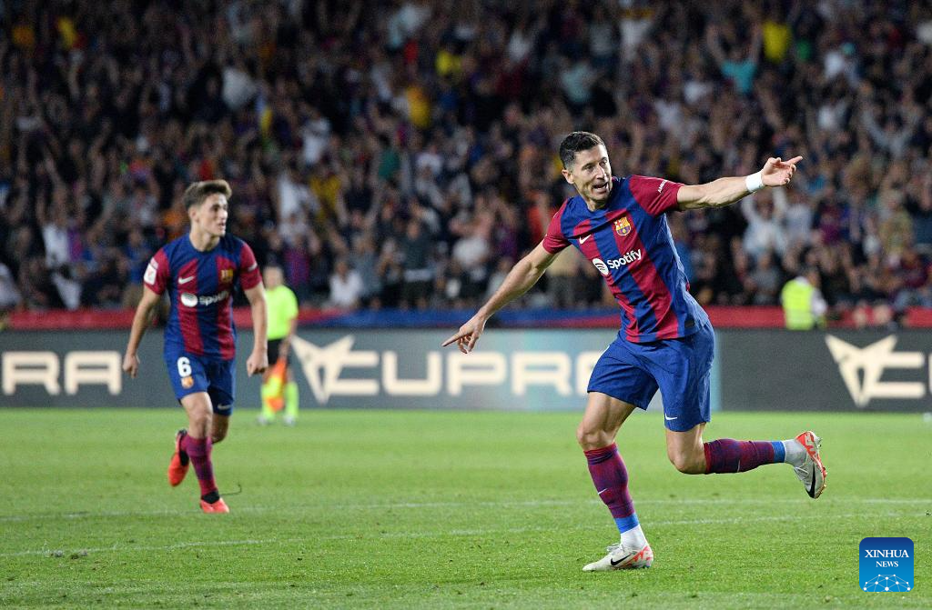 Robert Lewandowski (R) of Barcelona celebrates a goal during a La Liga football match between Barcelona and Celta Vigo in Barcelona, Spain, Sept. 23, 2023. (Photo by Joan Gosa/Xinhua)