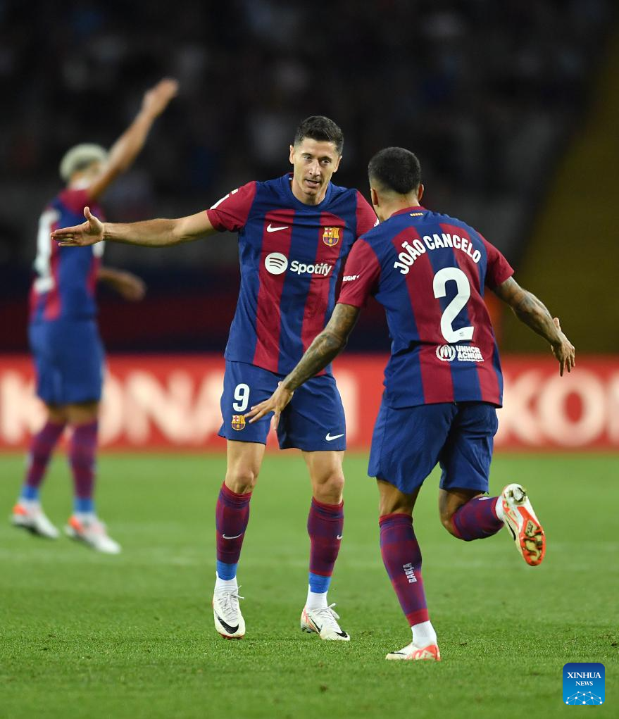 Robert Lewandowski (C) and Joao Cancelo (R) of Barcelona celebrate a goal during a La Liga football match between Barcelona and Celta Vigo in Barcelona, Spain, Sept. 23, 2023. (Photo by Joan Gosa/Xinhua)