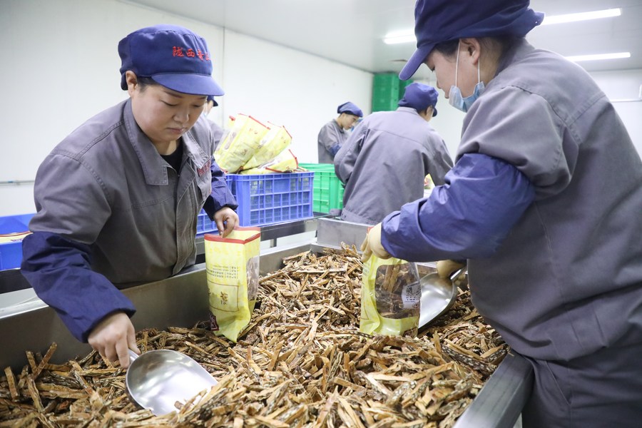 Workers pack Chinese herbal medicine at a company in Longxi County of Dingxi City, northwest China's Gansu Province, June 11, 2022.(Xinhua/Ma Xiping)
