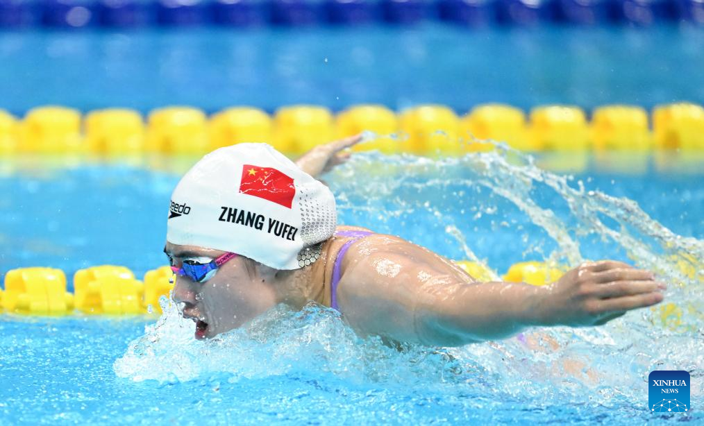 Zhang Yufei of China competes during the Women's 200m Butterfly Final at the 19th Asian Games in Hangzhou, east China's Zhejiang Province, Sept. 24, 2023. (Xinhua/Xia Yifang)