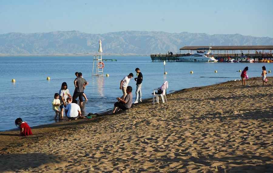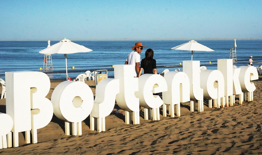 Tourists visit the Dahekou scenic spot of Bosten Lake in Bohu County, northwest China's Xinjiang Uygur Autonomous Region, Aug. 31, 2023. (Xinhua/Jin Haoyuan)