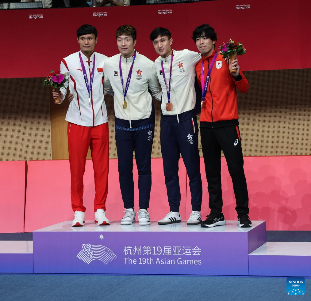 Silver medalist Chen Haiwei of China, Gold medalist Cheung Ka Long of China's Hong Kong, Bronze Medalists Choi Chun Yin Ryan of China's Hong Kong and Shikine Takahiro of Japan (L-R) attend the awarding ceremony of the Men's Foil Individual at the 19th Asian Games in Hangzhou, east China's Zhejiang Province, Sept. 24, 2023. (Xinhua/Xu Yu)