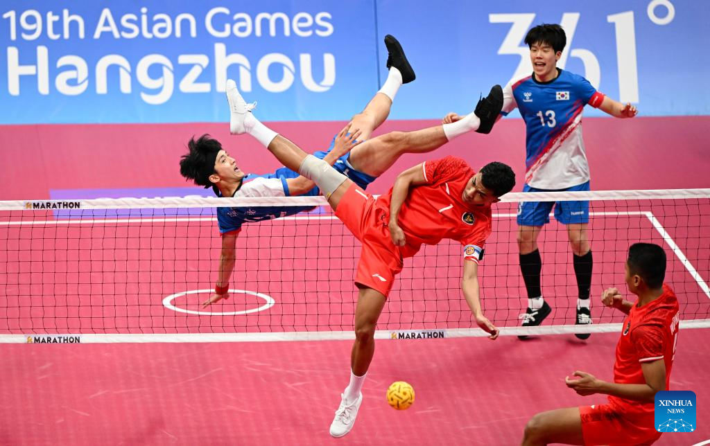 Team Thailand compete against Team Laos during Men's Team Regu Preliminary Match of Sepaktakraw at the 19th Asian Games in Jinhua, east China's Zhejiang Province, Sept. 24, 2023. (Xinhua/Chen Zhonghao)