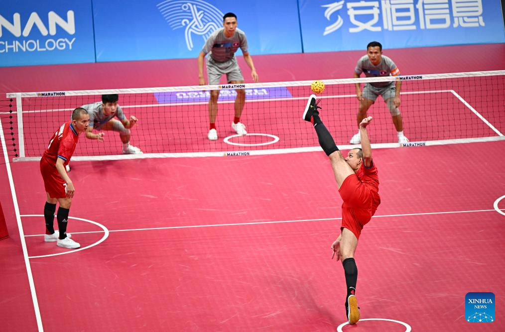 Varayut Jantarasena of Team Thailand kicks the ball during Men's Team Regu Preliminary Match of Sepaktakraw between Thailand and Laos at the 19th Asian Games in Jinhua, east China's Zhejiang Province, Sept. 24, 2023. (Xinhua/Chen Zhonghao)