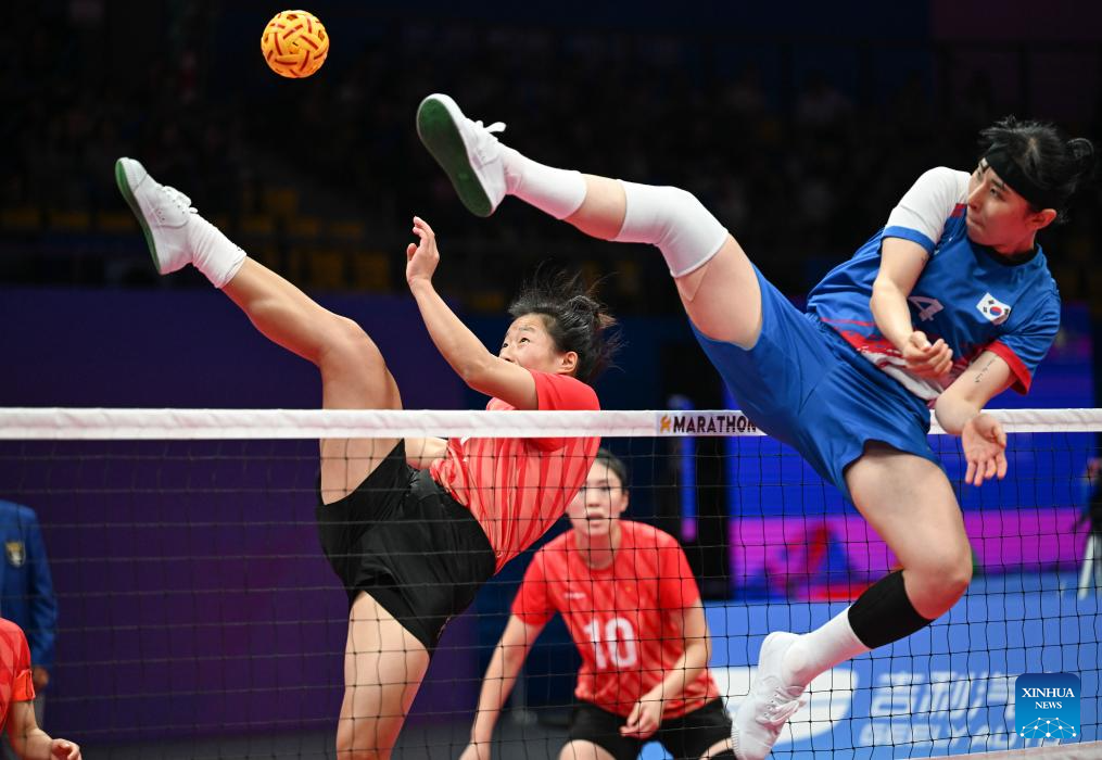 Chen Yan (L, back) of Team China competes against Park Seonju (R, front) of South Korea during Women's Team Regu Preliminary Match of Sepaktakraw between China and South Korea at the 19th Asian Games in Jinhua, east China's Zhejiang Province, Sept. 24, 2023. (Xinhua/Chen Zhonghao)
