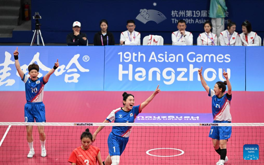 Team South Korea celebrate during Women's Team Regu Preliminary Match of Sepaktakraw between China and South Korea at the 19th Asian Games in Jinhua, east China's Zhejiang Province, Sept. 24, 2023. (Xinhua/Chen Zhonghao)