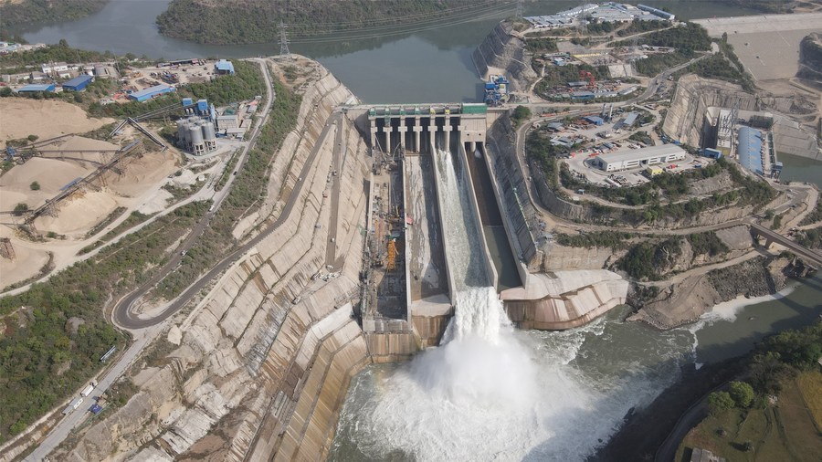 Aerial photo taken on April 9, 2022 shows a view of the Karot Hydropower Project in Punjab province, eastern Pakistan. It is a major pilot project under the China-Pakistan Economic Corridor (CPEC), that will generate environment-friendly and cheap electricity, promoting green development in Pakistan. (CTG/Handout via Xinhua)