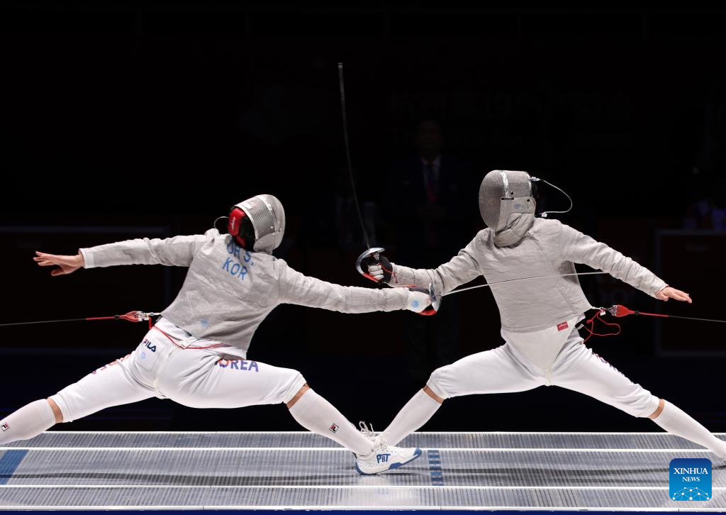 GU Bongil (R) of South Korea competes during the Men's Sabre Individual Gold Medal Bout of Fencing at the 19th Asian Games in Hangzhou, east China's Zhejiang Province, Sept. 25, 2023. (Xinhua/Yang Lei)